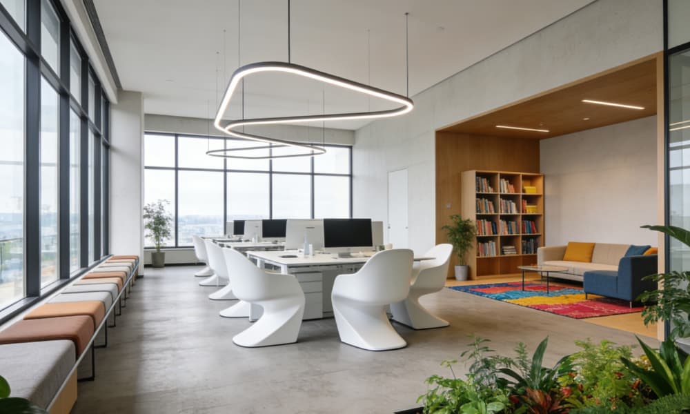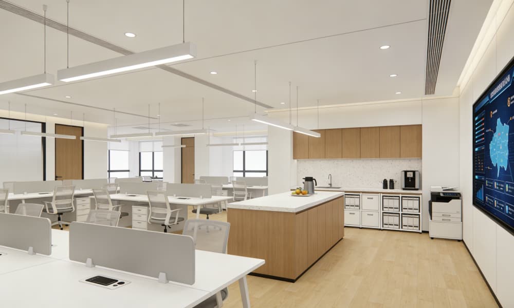 整體色調以白色、灰色為主,搭配少量黑色線條作為點綴,營造出簡潔大氣的視覺效果。材料運用上,注重質感與耐用性,采用玻璃、金屬、石材等現(xiàn)代材質,彰顯工業(yè)場所的專業(yè)性與品質感。在空間設計中,強調開放性與通透感,讓自然光線充分滲透,提高空間的舒適度與工作效率。