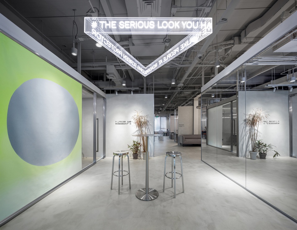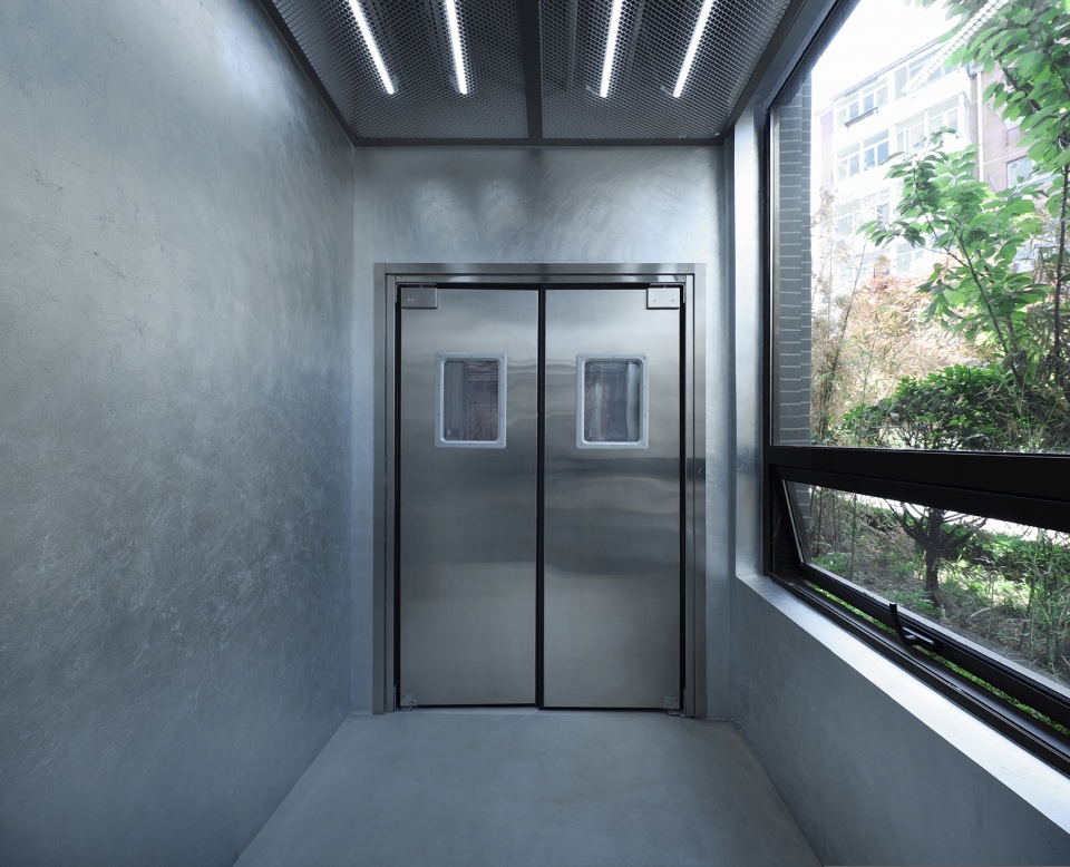 空間有兩個入口,主入口保證通行和展示,次入口則作為一個工廠的精神象征。設(shè)計師采用工廠車間金屬推拉門和防撞門作為工廠的大門,將粗獷銳利的工業(yè)感發(fā)揮到極致。前廳四壁貼有銀箔,作為對電影《Factory Girl》的致敬。