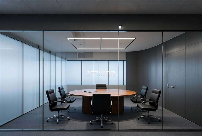 本方案采用現(xiàn)代簡(jiǎn)約設(shè)計(jì)語(yǔ)言,整體空間以淺灰、白、原木三色為主基調(diào)。前臺(tái)區(qū)設(shè)置懸浮式接待臺(tái)與發(fā)光LOGO墻,搭配LED線性照明塑造企業(yè)形象。開放式辦公區(qū)采用模塊化工位布局,通過玻璃隔斷劃分功能區(qū)域,保證自然采光最大化的同時(shí)提升空間通透感。智能會(huì)議系統(tǒng)集成于各會(huì)議室,配備電動(dòng)投影和書寫玻璃墻。經(jīng)理室采用深藍(lán)色烤漆木飾面提升商務(wù)質(zhì)感,休息區(qū)設(shè)置咖啡吧與卡座強(qiáng)化員工關(guān)懷。走廊運(yùn)用導(dǎo)視燈帶串聯(lián)各區(qū)域,茶水間六角地磚增添趣味性。培訓(xùn)室階梯式布局配合吸音墻面確保聲學(xué)效果,電話間磨砂玻璃立方體兼顧隱私與采光。VIP室智能霧化玻璃實(shí)現(xiàn)空間靈活轉(zhuǎn)換,整體設(shè)計(jì)注重功能分區(qū)與人文關(guān)懷的平衡。