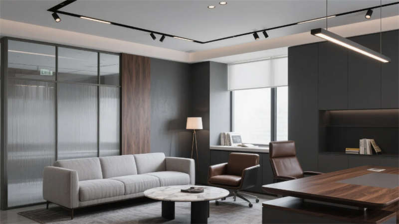 高管辦公區(qū)通過灰玻與豎向木紋鋁材構(gòu)筑半私密空間,L型胡桃木辦公桌與深棕真皮座椅彰顯商務(wù)質(zhì)感,獨立閱讀角的落地燈營造人文氛圍??偛棉k公室運用懸浮式書架墻與黑檀木辦公桌塑造權(quán)威感,環(huán)形皮革沙發(fā)組與天然大理石茶幾構(gòu)成高端會客場景,日式茶室通過木格柵與洞石墻面實現(xiàn)東西方美學交融。