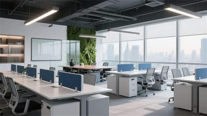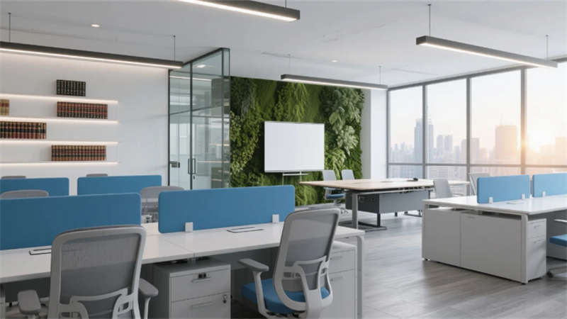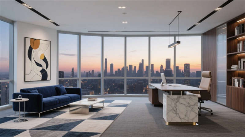 入口處弧形接待臺(tái)似律法天平,發(fā)光企業(yè)標(biāo)識(shí)懸浮于透光大理石背景墻,線性燈光如正義之軌延伸至開(kāi)放式辦公區(qū)。玻璃幕墻外合肥城市天際線成為動(dòng)態(tài)畫(huà)布,智能升降桌與模塊化工位詮釋高效協(xié)作。合伙人辦公室的270°環(huán)景視野,將巢湖煙波與都市繁華收于案頭,霧化玻璃在私密與開(kāi)放間自由切換。