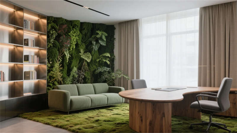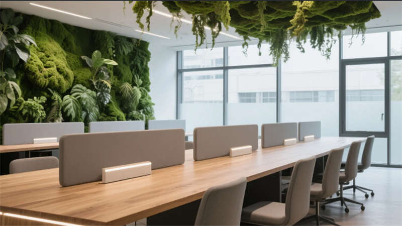 該設(shè)計(jì)以“自然共生”為脈絡(luò),將綠植生態(tài)系統(tǒng)與現(xiàn)代辦公需求深度融合。入口處以苔蘚藝術(shù)臺(tái)與流水光墻奠定基調(diào),流動(dòng)的綠意從呼吸幕墻延伸至開放辦公區(qū),原木桌面在漫射天光中模糊室內(nèi)外界限。獨(dú)立辦公室的垂直森林墻與靜音艙的苔蘚隔斷,在私密空間延續(xù)生態(tài)語(yǔ)言。