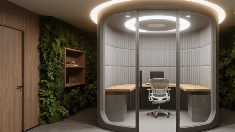貫穿始終的啞光木紋、編織材質(zhì)與暖灰調(diào),弱化傳統(tǒng)辦公的冷硬感;隱藏式光源在艙體、書架與吧臺(tái)處暈染出靜謐氛圍。苔蘚地毯、垂吊蕨類等細(xì)節(jié),將合肥在地自然意象轉(zhuǎn)化為空間韻律,形成一座會(huì)呼吸的現(xiàn)代辦公聚落。