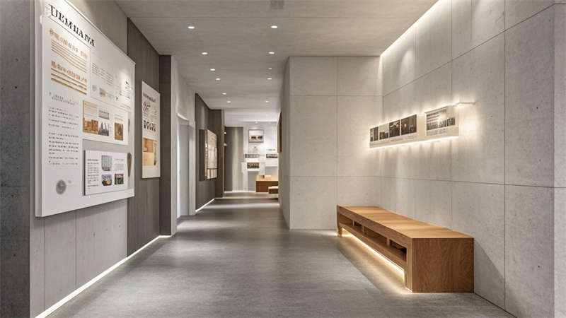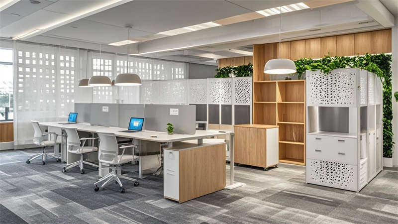 ④聲學(xué)吊頂確保35分貝以下靜音環(huán)境。色彩搭配采用70%淺灰奠定基調(diào),20%原木色增添溫暖,10%企業(yè)藍(lán)作為點(diǎn)睛色。環(huán)保方面選用LEED認(rèn)證材料,集成光伏玻璃幕墻年發(fā)電量達(dá)8萬度。