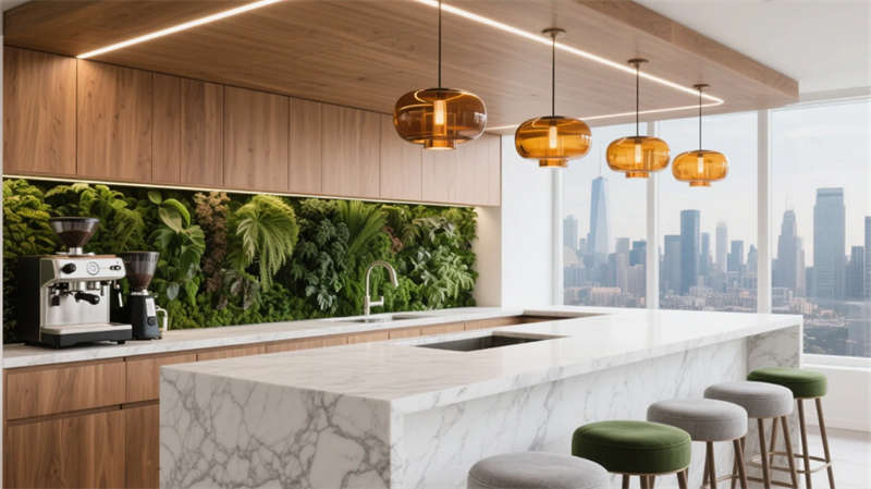 這座辦公空間以「自然共生」為脈絡(luò),將科技智能隱于溫潤(rùn)質(zhì)感之中。入口處生態(tài)前臺(tái)以洞石與苔蘚破界對(duì)話,定調(diào)空間的生命力;開(kāi)放協(xié)作區(qū)如流動(dòng)的創(chuàng)意河谷,模塊家具隨需求自由重組,綠植隔斷悄然凈化空氣;散落的靜音艙與冥想穹頂,為深度思考提供呼吸間隙。
