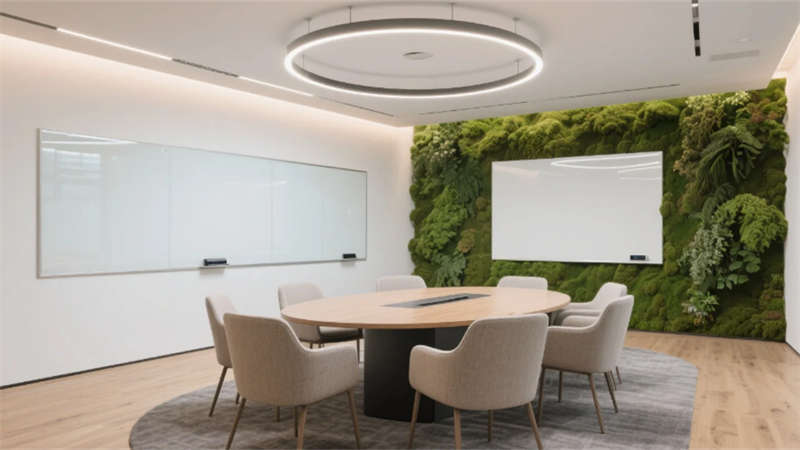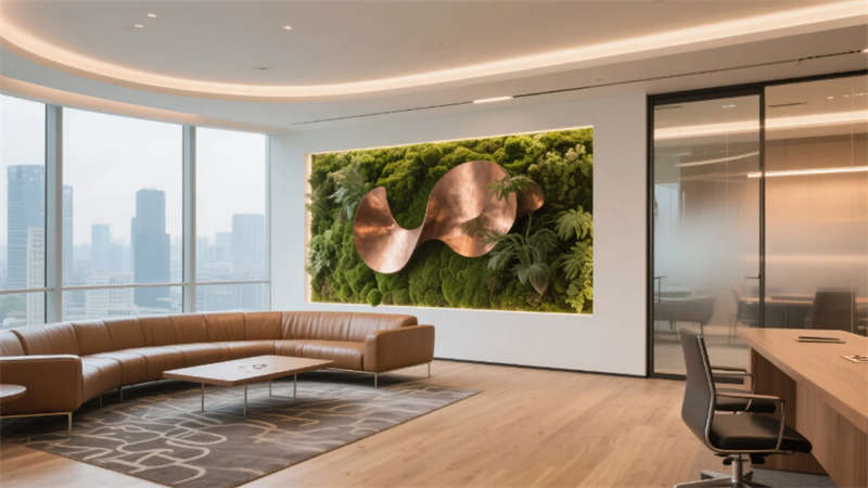 生態(tài)科技體系覆蓋全場景:經(jīng)理辦公室苔蘚墻集成空氣監(jiān)測系統(tǒng),總裁室霧化玻璃聯(lián)動光伏發(fā)電,小會議室綠植墻搭載微滴灌節(jié)水裝置。材質(zhì)選用安徽本土元素升級再造,大廳水磨石摻入大別山礦石粉,定制地毯紋樣提取徽派窗欞數(shù)字化變體。