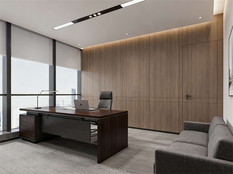 開放辦公區(qū)以通透協(xié)作為設(shè)計重點(diǎn),半透明磨砂玻璃隔板兼顧隱私與互動,木色桌面與深灰金屬支架結(jié)合,延續(xù)整體材質(zhì)基調(diào),搭配簡約照明,營造專注且不壓抑的工作氛圍。獨(dú)立辦公室劃分出辦公與接待區(qū)域,木飾面背景墻搭配淺灰布藝沙發(fā),在保持商務(wù)感的同時,增添柔和質(zhì)感,滿足私密溝通需求。