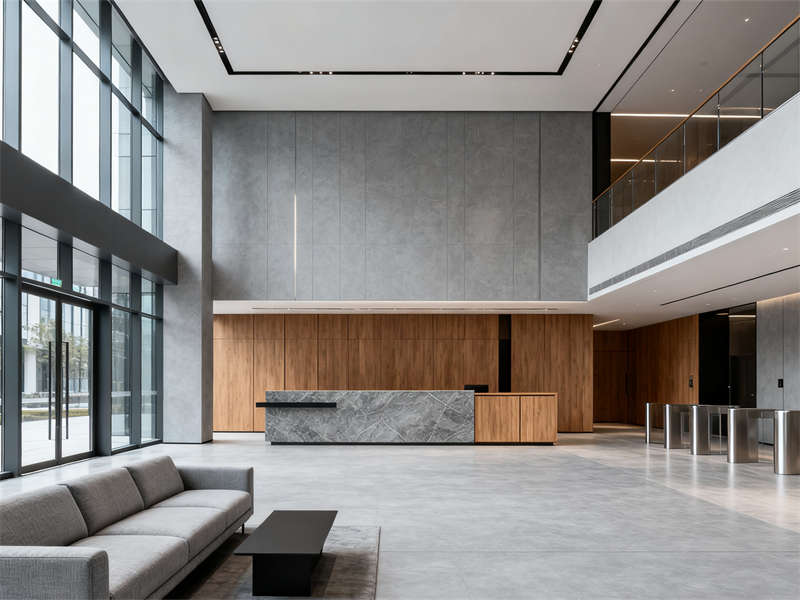 入口大堂以開闊格局為核心,淺灰地磚搭配低飽和木色前臺,弱化厚重感的同時,用金屬線條勾勒細(xì)節(jié),讓第一印象既專業(yè)又通透。玻璃隔斷貫穿多個區(qū)域,在走廊處搭配木色門牌,既保證采光,又通過材質(zhì)呼應(yīng)強(qiáng)化整體感,避免空間割裂。