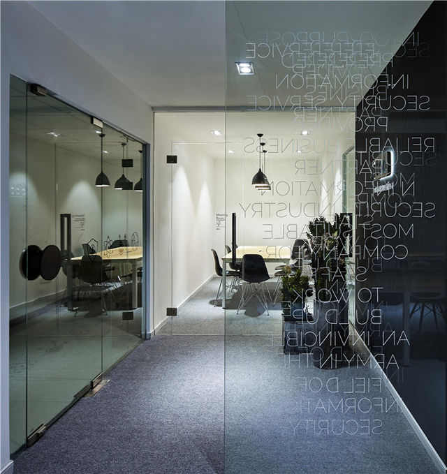 業(yè)主希望突出公司的科技感,主要就以黑白為主,玻璃上的裝飾采用正反拼貼,營造出慢慢消印的代碼的科技感。為了節(jié)省造價,空間使用常規(guī)建材乳膠漆、地毯、地平漆。