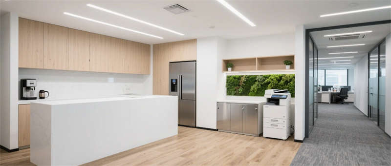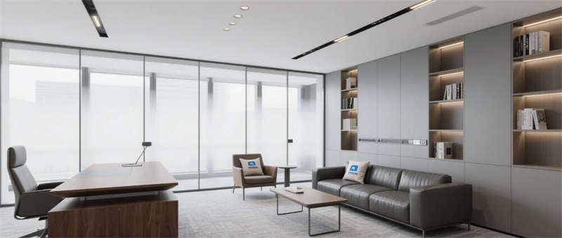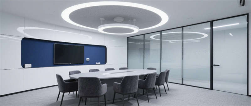高管辦公室通過灰玻霧化膜實現(xiàn)私密與通透的辯證,胡桃木辦公桌與深灰沙發(fā)組演繹商務美學,隱藏式智能控制系統(tǒng)將科技感融于無形??萍紩h室創(chuàng)新采用環(huán)形桌體與360°攝像系統(tǒng),陣列麥克風與補光燈帶打造沉浸式遠程協(xié)作場景。從光伏玻璃幕墻到模塊化綠植系統(tǒng),從智能升降辦公桌到節(jié)能設備集群,每個細節(jié)都銘刻著可持續(xù)發(fā)展的空間基因。