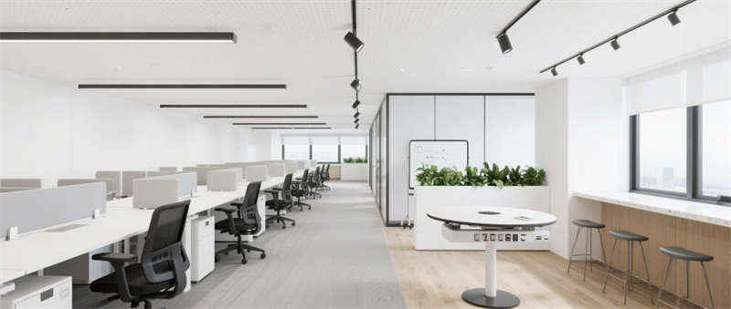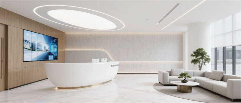 步入企業(yè)大堂,淺白大理石與溫潤木紋墻面形成材質對話,懸浮式線性燈光如時空隧道貫穿空間。深藍色企業(yè)LOGO在弧形純白前臺形成視覺錨點,數字影像墻實時跳動的數據流與模塊化沙發(fā)區(qū)的綠植盆景構成動與靜的平衡。辦公區(qū)采用模塊化升降系統(tǒng),穿孔吸音天花與協(xié)作島構成靈活辦公矩陣,落地窗邊的高吧臺休憩區(qū)借綠植隔斷營造都市綠洲意境。