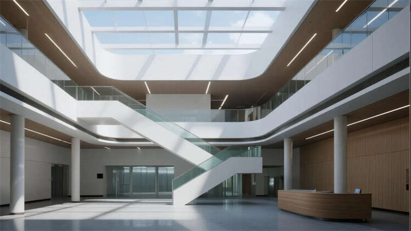 空間內核強調人性化體驗:挑高中庭以懸浮樓梯創(chuàng)造輕盈動線,屋頂花園成為員工觸摸自然的窗口;無柱車間與智能實驗室展現(xiàn)工業(yè)精密感,而木格柵連廊與綠植墻則注入人文溫度。夜幕降臨時,建筑化為光影容器,冷白光帶勾勒結構輪廓,暖黃窗格透出工作場景的活力。