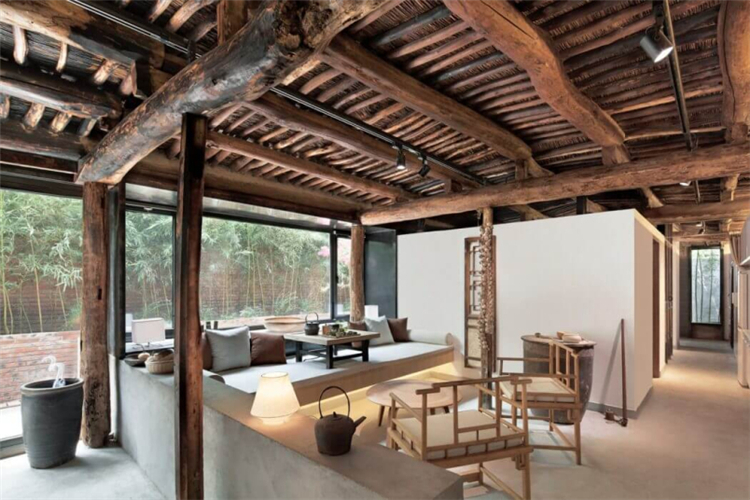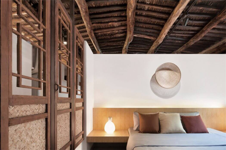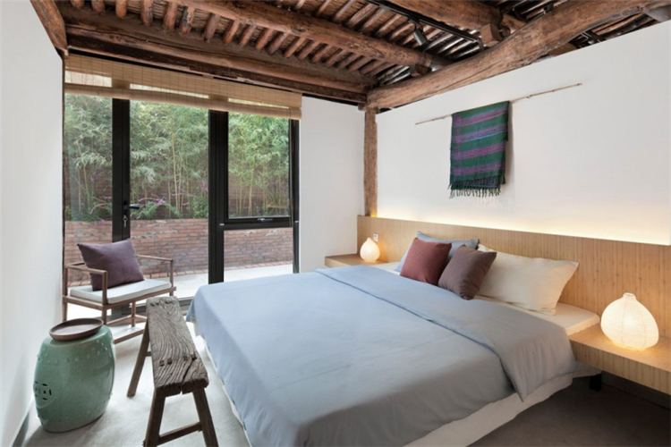 而我們在這次的民宿的功能布局方面,我們根據(jù)與居民的詳細(xì)溝通,了解他們的日常生活和習(xí)慣,進行調(diào)整,重新組織平面圖。在我們拆除吊頂后,更多的空間被釋放,原始的木結(jié)構(gòu)和稻草覆蓋的天花板紋理終于顯露出來,講述了一個時間的故事。在現(xiàn)場勘察過程中,我們在建筑物西側(cè)和鄰近墻壁之間發(fā)現(xiàn)了一條約80厘米寬的狹窄通道。因此,我們在走廊盡頭向西側(cè)設(shè)計了一個觀景窗。在窗外,擺動的竹影有助于將室內(nèi)空間與自然環(huán)境相連。