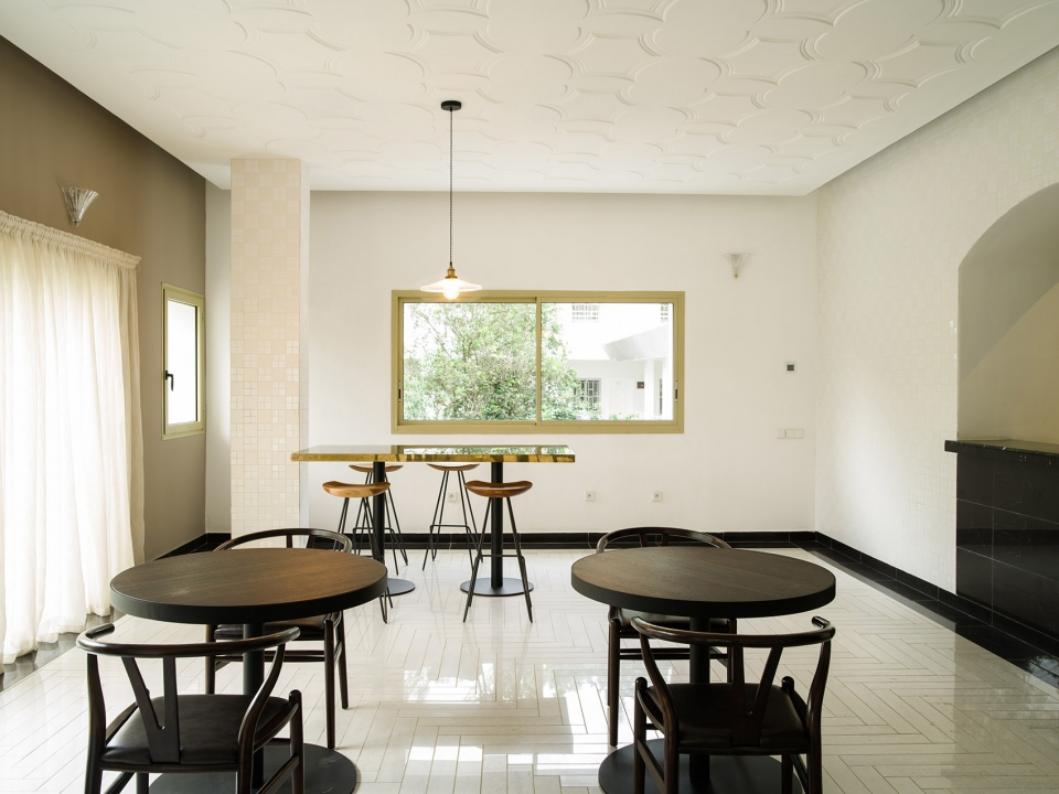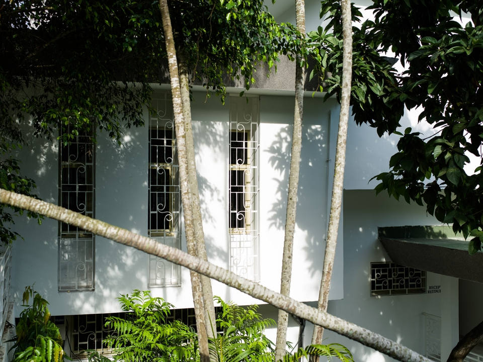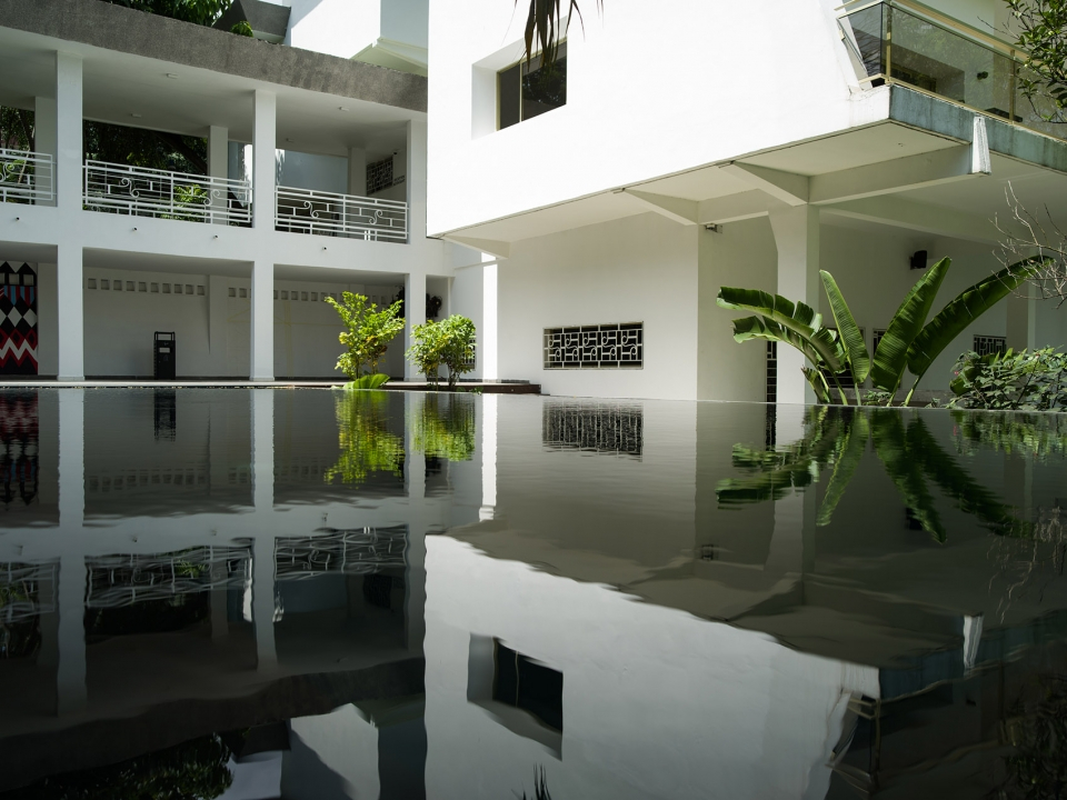 酒店外觀局部,建筑在泳池中投下倒影,部分外部視圖,池反射建筑物。健身房和養(yǎng)生區(qū)位于原建筑的廚房處,擁有良好的自然通風(fēng)以及朝向。游泳池又長(zhǎng)又窄,客人們可以在其中進(jìn)行來(lái)回往復(fù)式的游泳運(yùn)動(dòng),同時(shí)還在炎炎夏日里為客人們提供了一個(gè)消暑空間,當(dāng)?shù)貥淠镜娜~子和開(kāi)花植物則為泳池空間提供了遮陰處和裝飾。