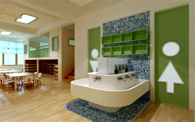 洗手區(qū)域的設(shè)計:此處通往的是就餐區(qū),在洗手池的設(shè)計上,設(shè)計師對地面、洗手池都做了處理,目的就是為了避免因為水造成的地面濕滑,兩個門一個進(jìn)一個出,設(shè)計是希望可以從小培養(yǎng)孩子排隊的意識,一進(jìn)一出之間也見證了教育的重要性。