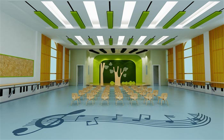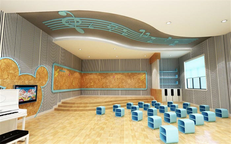 音樂教室的設(shè)計:這里大致可以容納下30多個小朋友,也就是大概一個班多一點點,能歌善舞是每個家長對于孩子的特殊期望,對于孩子本身來說也是一個不可不得的技能,在設(shè)計師看來若是引導(dǎo)得當(dāng),讓孩子喜歡唱歌、跳舞也不失為一件功德無量的事情。