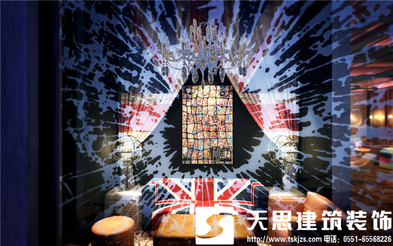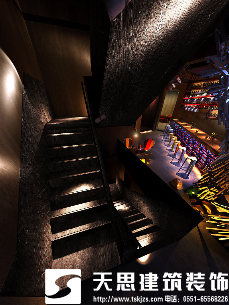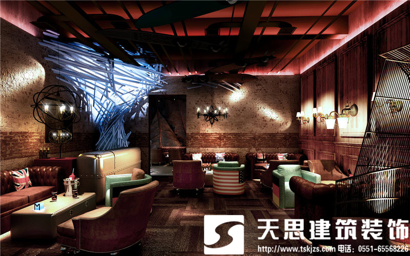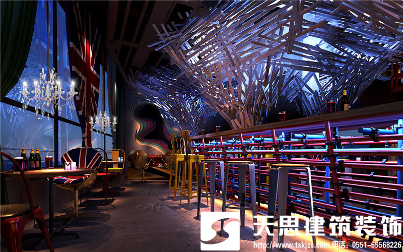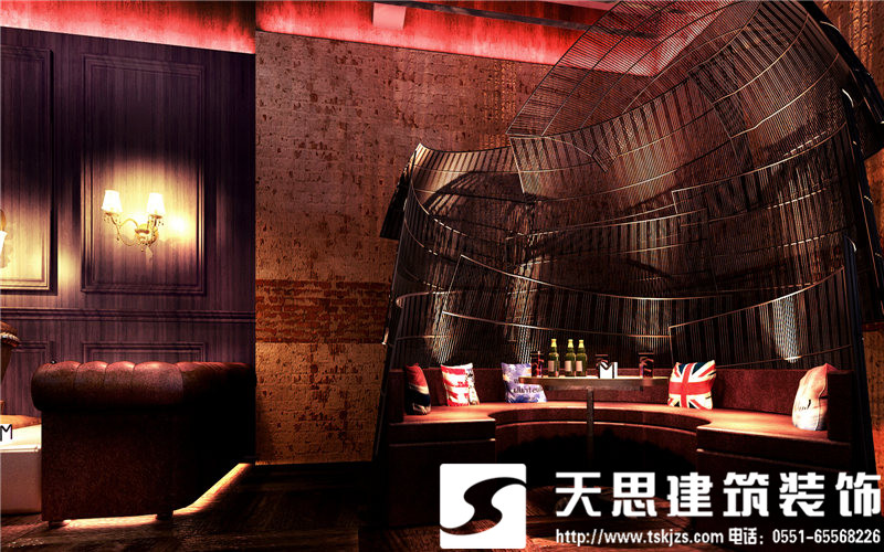 一層吧臺(tái)處,方鋼構(gòu)建的造型樹自由,飄逸,充滿藝術(shù)張力。鋁制吧臺(tái)搭配特制的建筑腳手架座椅,工業(yè)范兒十足,還原了建筑的純粹美感。鋼板樓梯處用射燈做呼應(yīng),浪漫且工業(yè)氣息濃郁。通道處,玫瑰金鋼板勾勒的點(diǎn)點(diǎn)星光自由浪漫,展現(xiàn)了工業(yè)元素的獨(dú)有魅力。包間,原有紅磚墻處理后的墻面中性硬朗,鐵網(wǎng)做成的遮擋裝飾飄逸自由,營(yíng)造的私密效果恰到好處。玻璃上的手繪勾勒出包間裝飾畫,讓視角多了一絲抽象派的趣味。