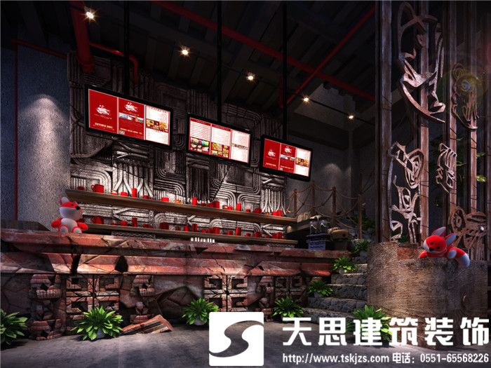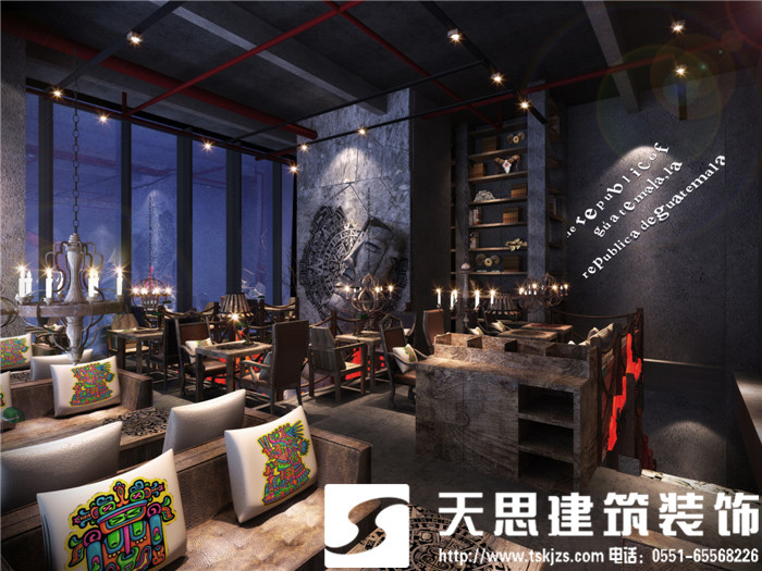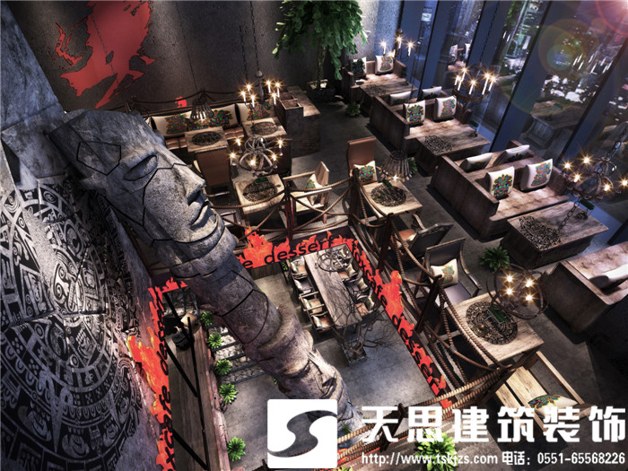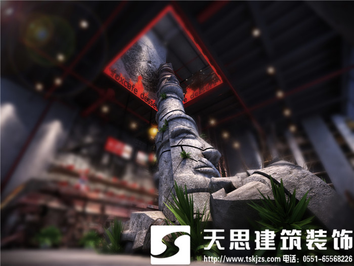 此案運(yùn)用破碎的瑪雅建筑紋理作為主元素貫穿整體空間設(shè)計(jì),將消失的瑪雅文化融入到設(shè)計(jì)風(fēng)格里,用藝術(shù)化自然化的設(shè)計(jì)手法將簡(jiǎn)陋的空間置換為國(guó)際潮流空間設(shè)計(jì)風(fēng)尚。僅用一根從底層直穿二樓的人面雕塑就巧妙規(guī)避了空間的局促感,成為整體空間設(shè)計(jì)最凝練的一筆。整體空間基調(diào)沉穩(wěn),清水混凝土、石頭以及原木都為統(tǒng)一的暗色系,為了突出火狐的特色,將紅色引入空間,不僅活躍了空間,也讓品牌形象悄然流露。