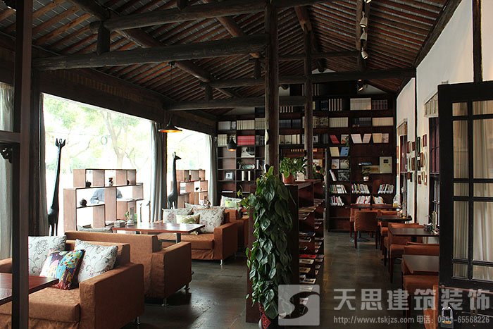 在具有典型中式木結(jié)構(gòu)的大屋里,整齊擺放著木制書架,上面堆滿了各類書籍??Х认惆橹鴿鉂獾臅砦叮高^舊木窗,飄向遠處的天井、檐廊。融進白墻黛瓦里。