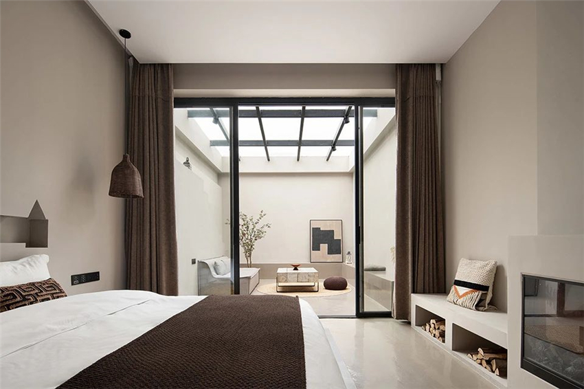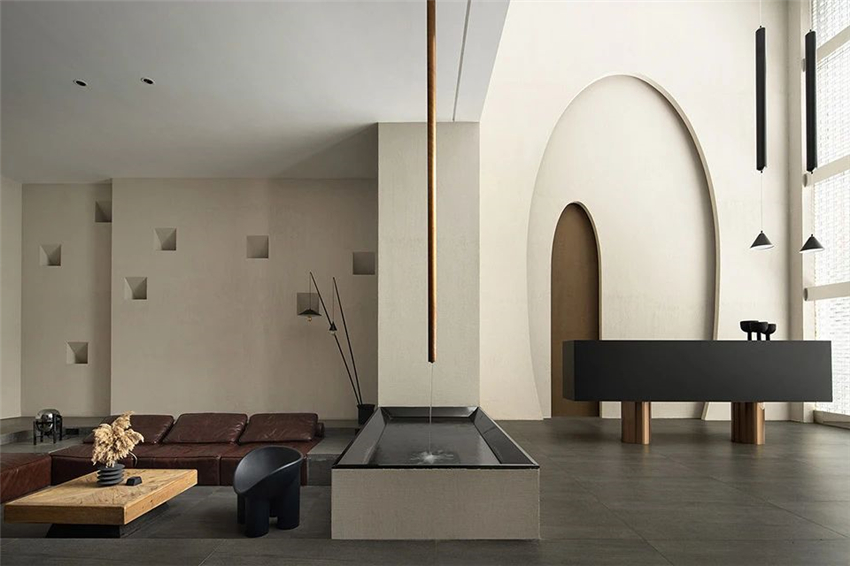 中性的色彩美學為基調(diào),無彩色與暖調(diào)的咖色相互補充,一抹深色,使空間靜默下來,將溫柔緩緩釋放。柔涓的水流墜落在水面上,蕩起一圈小渦,我們喜歡這種流動性,有種輕盈的感覺。