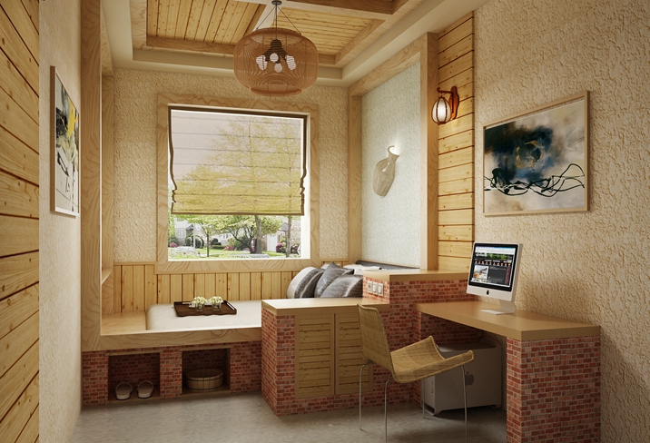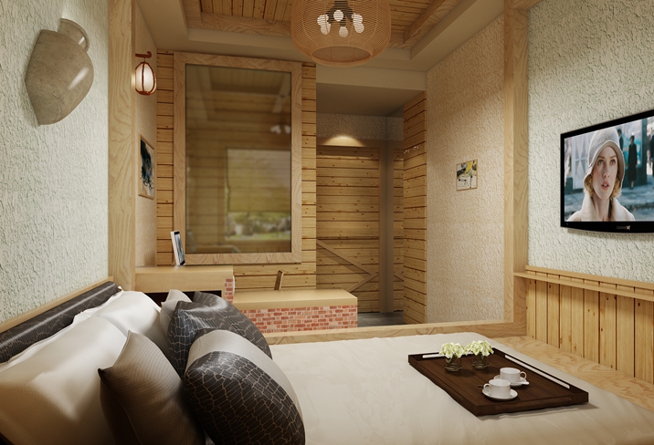 該項(xiàng)目主要是以近代的炕及木制品為元素,房間的床、電腦桌、電視柜、床頭柜都是用紅磚清水墻砌的,墻面是白色的彈涂顆粒飽滿十分的美觀,頂面局部采用的是桑拿板吊頂,其余部分為石膏板吊頂噴彈涂,加上特色的壁燈,讓人置身其中有種回到中國近代的感覺。