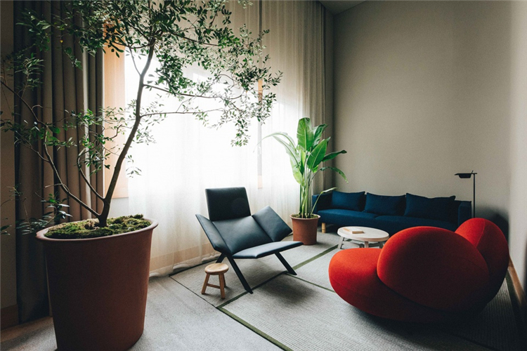 酒店的客房同樣色彩斑斕??头康拈_放空間中央立有大型紗柱,懸掛著自然染色的靛藍色漸變織物??头靠崭唛_闊,四周擺設有CKR設計的沙發(fā),皮革躺椅及一系列盆栽裝飾。同時,房間內配有唱片機及精選的黑膠唱片,為房間帶來了親切感。房間內的照明采用特別設計的燈具,其中以定制的紙質燈最具特色。此外酒店客房,套房及復式套房中,都采用了紡織品裝飾的定制雙人沙發(fā)。