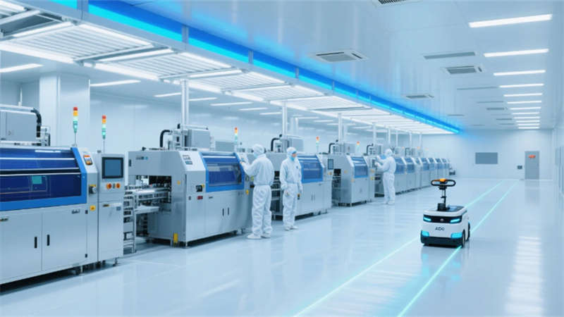 這個(gè)潔凈車間廠房,以未來(lái)工業(yè)美學(xué)為語(yǔ)言,詮釋新能源智造的全新范式。通透的玻璃幕墻與菱形光伏屋頂交織,將自然光引入車間,與冷調(diào)LED光帶共構(gòu)科技與生態(tài)的平衡。核心生產(chǎn)區(qū)如同精密運(yùn)轉(zhuǎn)的“硅基心臟”,層流送風(fēng)系統(tǒng)無(wú)聲守護(hù)著無(wú)塵環(huán)境,自動(dòng)化設(shè)備在藍(lán)色光暈中有序協(xié)作,AGV穿梭的軌跡編織出無(wú)聲的效率詩(shī)篇。