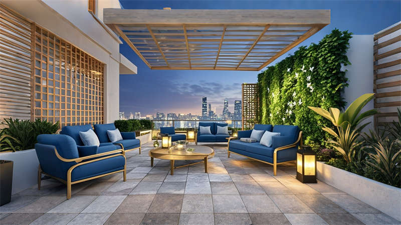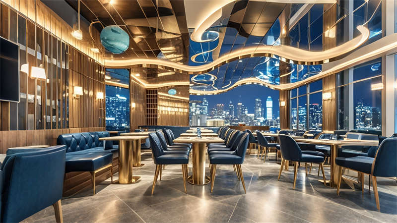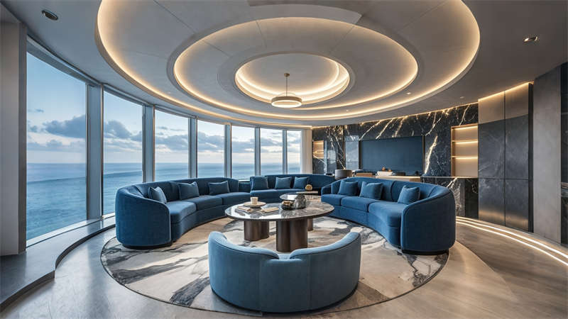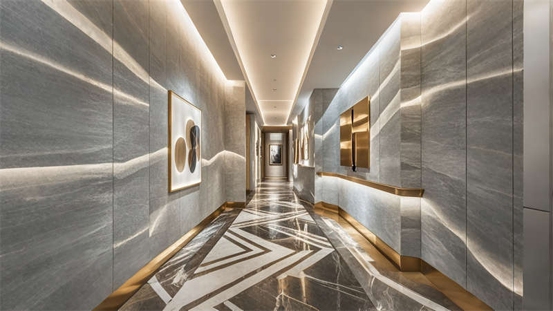 色彩體系以香檳金與深海藍(lán)為主調(diào),大堂采用香檳金金屬線條勾勒建筑肌理,搭配深海藍(lán)大理石營造視覺重心??头繀^(qū)運(yùn)用暖灰硬包墻面平衡色彩強(qiáng)度,通過2700K暖光與4000K中性光分區(qū)照明塑造晝夜場景。材質(zhì)組合注重層次:大理石地面、金屬構(gòu)件、絨布軟包形成質(zhì)感三部曲。