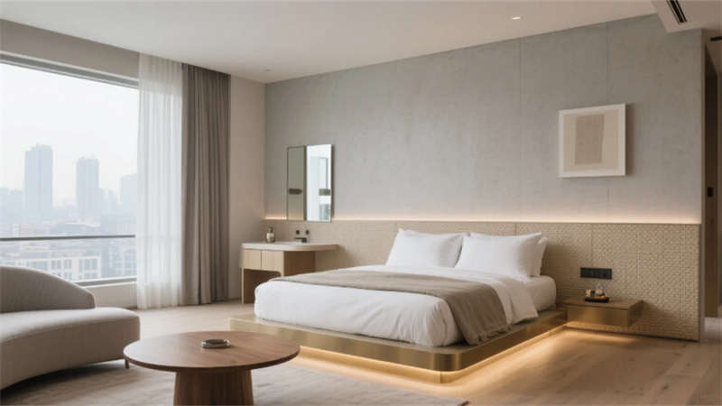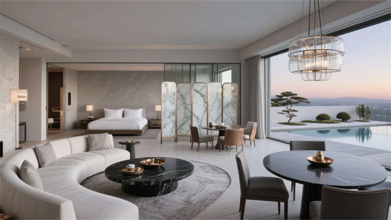 步入挑高的大堂,原木與石材的碰撞詮釋著質(zhì)樸的高級感。懸浮玻璃樓梯如透明絲帶盤旋而上,紙藝褶皺吊燈灑下柔和光暈,綠植墻在隱藏式燈光中若隱若現(xiàn),仿若一幅當代山水畫卷??头恳耘遗c米白為基調(diào),亞麻、微水泥與天然木紋織就療愈氛圍,弧形沙發(fā)與嵌入式燈帶讓空間流動著溫柔詩意,落地窗將城市天際線化為朦朧背景。