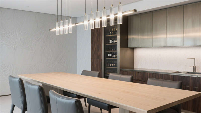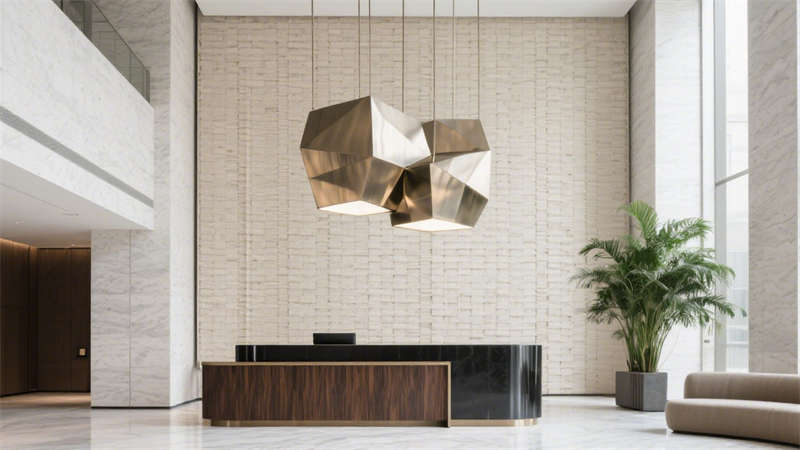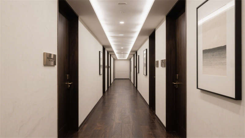 在公共區(qū)域,大堂以開(kāi)闊通透的布局呈現(xiàn),大面積的落地玻璃引入充足自然光線,讓空間更顯明亮通透。接待區(qū)選用柔軟的布藝沙發(fā)與金屬質(zhì)感的裝飾擺件相搭配,既傳遞出溫馨的氛圍,又不失精致格調(diào)。走廊設(shè)計(jì)則注重引導(dǎo)性,墻面采用肌理感材質(zhì),搭配嵌入式燈光,營(yíng)造出靜謐而優(yōu)雅的行走體驗(yàn)。