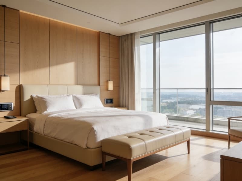 二至四層為住宿層,規(guī)劃約80間客房,包括豪華房、行政房等房型??头恳詼\木色為主調(diào),搭配真皮軟裝與柔和燈光,營造溫馨氛圍。每間客房均配備智能客控系統(tǒng),方便客人操作。