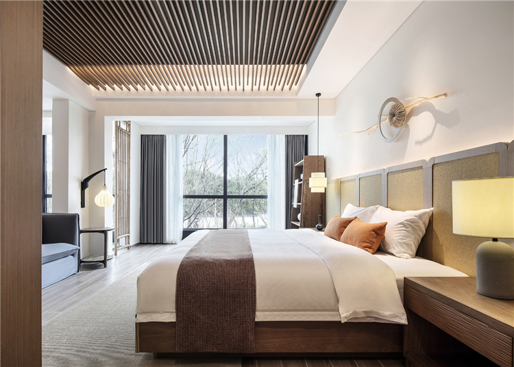 客房布草裝飾選用棉麻材質,色彩過渡柔和,給人暖意。床頭的實木雕畫回歸原野古樸,竹編吊燈造型各異,一花一草一木皆入景,簡而裁,巧而自然。竹藏風雨,觸及野趣,山居生活隱逸悠然,靜念生長。