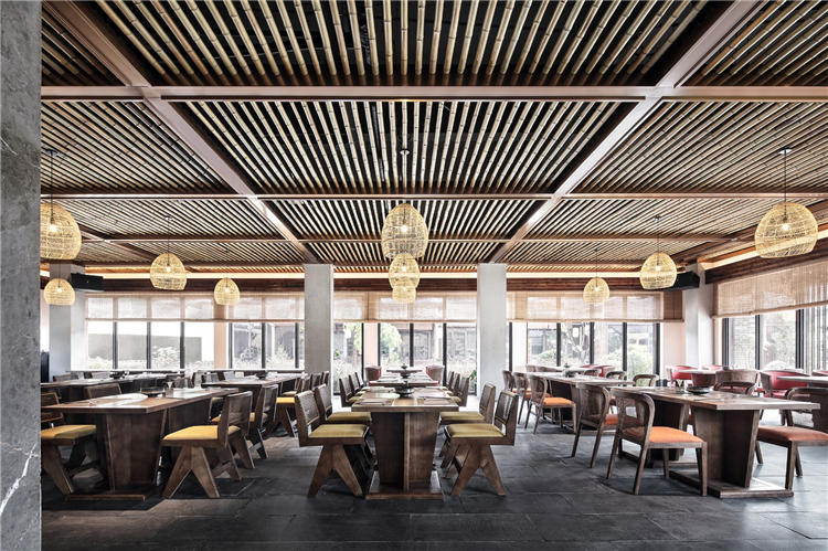 九華當?shù)囟嘀衲?,設計就地取材,空間中運用較多原木家具和竹制吊燈,及一些土陶制品,表達對本土文化的致敬和延續(xù),凈土在禪,于自然質樸之中,斂去了浮華氣息。