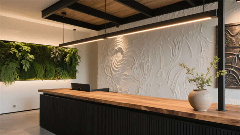 步入大廳,弧形亞麻沙發(fā)與編織地毯圍合出松弛場域,整面落地窗借景庭院竹影,琴葉榕與懸浮綠植墻形成立體生態(tài)敘事。多功能區(qū)以巢湖水波紋地毯呼應(yīng)地域脈絡(luò),壁爐旁的非遺火筆畫裝置暗藏城市文化密碼??Х劝商倬幾闻c水磨石臺(tái)面碰撞,幾何綠植墻在百葉光影中演繹晨昏詩意。