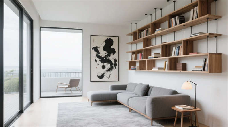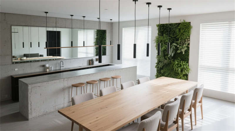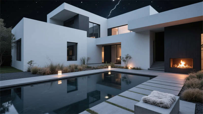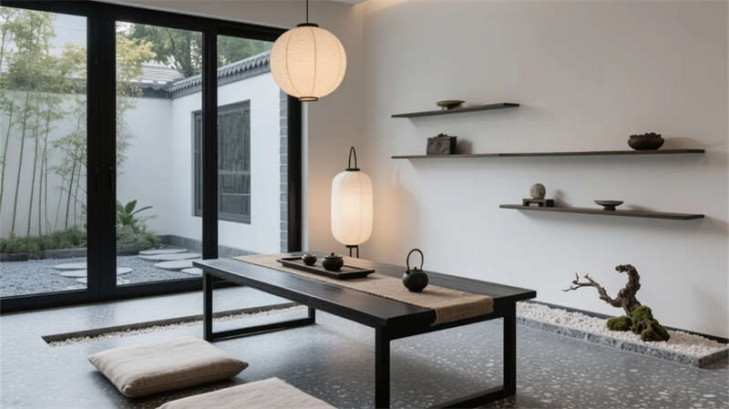 庭院成為生態(tài)樞紐,幾何水景倒映建筑體塊,耐旱植物與灰石板構成低維護景觀。多功能廳通過靈活隔斷適應共享需求,藝術品陳列架隨動線旋轉生趣。整體摒棄繁復裝飾,用材質本真觸感、光影時間軌跡與城市山水意境,營造大隱于市的當代棲居范本。