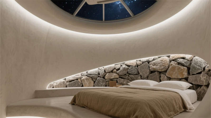 功能布局巧妙銜接室內外呼吸感:接待廳玻璃幕墻引竹林入畫,禪茶室借枯山水凝神靜氣;餐廳與書吧以可移動家具實現(xiàn)場景轉換,暗藏式光源在夜間描摹空間輪廓??头吭O計強調私密療愈,星空穹頂與混凝土浴缸形成原始與現(xiàn)代的詩意碰撞。