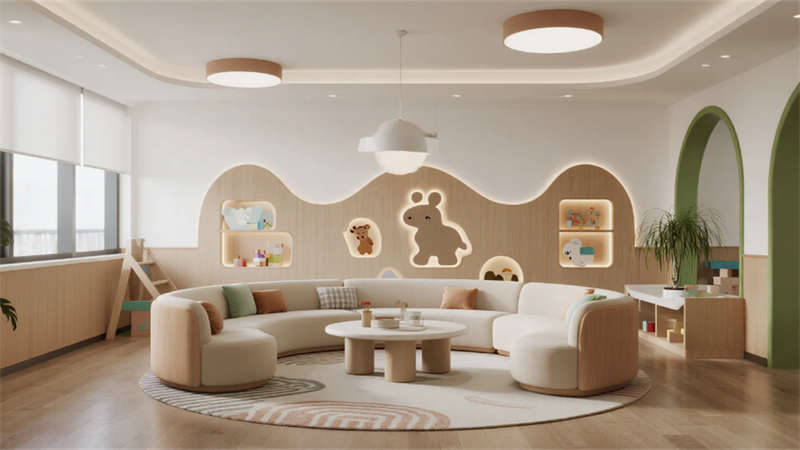 這座親子民宿以現(xiàn)代簡約美學(xué)為靈魂,將自然元素與童趣設(shè)計無縫銜接。空間摒棄繁復(fù)裝飾,選用淺木、純白與低飽和色彩鋪陳,弧形線條與柔和光影交織,營造出寧靜而溫暖的氛圍。從大堂的嵌入式動物燈箱到套房的樹屋床鋪,每一處細(xì)節(jié)都暗藏親子互動巧思,安全圓角家具與軟包地臺呵護孩童探索的每一步。