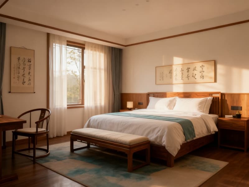 室內(nèi)空間借由廣角鏡頭可感知的通透布局,讓原木紋理成為空間的重要語言。公共區(qū)域的桌椅、隔斷均選用帶有自然木紋的實木材質(zhì),搭配淺色系軟裝,清晨的光線透過窗欞灑入,在木紋上形成柔和的光影,增添空間的層次感??头吭O計注重細節(jié),床頭背景墻以簡約的中式紋樣點綴,床品選用素雅色調(diào),與原木家具呼應,營造出安穩(wěn)休憩的氛圍。?
