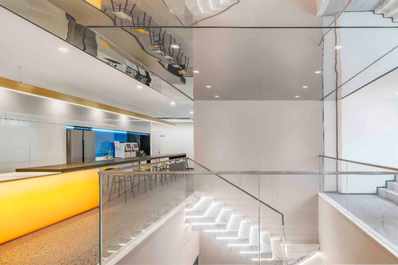 沉浸式體驗(yàn)人與空間交互,茶水區(qū)通過鏡面天花反射,光影在立體空間中流動(dòng),超動(dòng)感空間氛圍就此而生,板塊的不斷更新為它帶來永不停歇的活力,這里是“巨人”的世界。