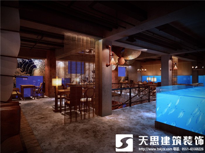 銅須水族主題會(huì)所,空間造型大氣磅礴,初入室內(nèi)即被粗獷自然的設(shè)計(jì)所震撼。給人一種無(wú)限擴(kuò)張的空間力量??臻g材料和色彩的運(yùn)用細(xì)膩而大膽,情節(jié)化的場(chǎng)景布置與戲劇性的張力設(shè)計(jì)營(yíng)造出豐富的視覺(jué)享受。