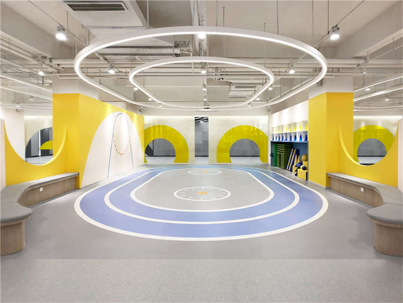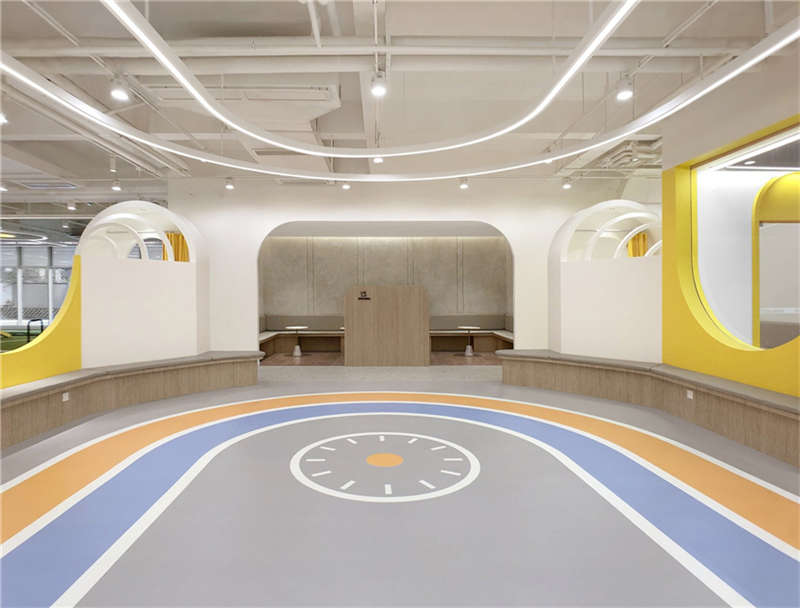 陽光洗禮這片綠茵,賦予茁壯的祝福。空間抹去一堵墻體,消弭了教室的結構,其功能得到了重塑,給組合課堂提供支持。地面的跑道被星球的神奇能量映射在空中,下一秒的跳躍,也許能乘駕著時間,奔跑向星辰和大海。每一個教室的教具都被用心安放,留給孩子們足夠的空間揮灑自由。柱間尺度的限制下我們轉換了家長的看課方式,親子間共同的成長是我們對場所的思考。
