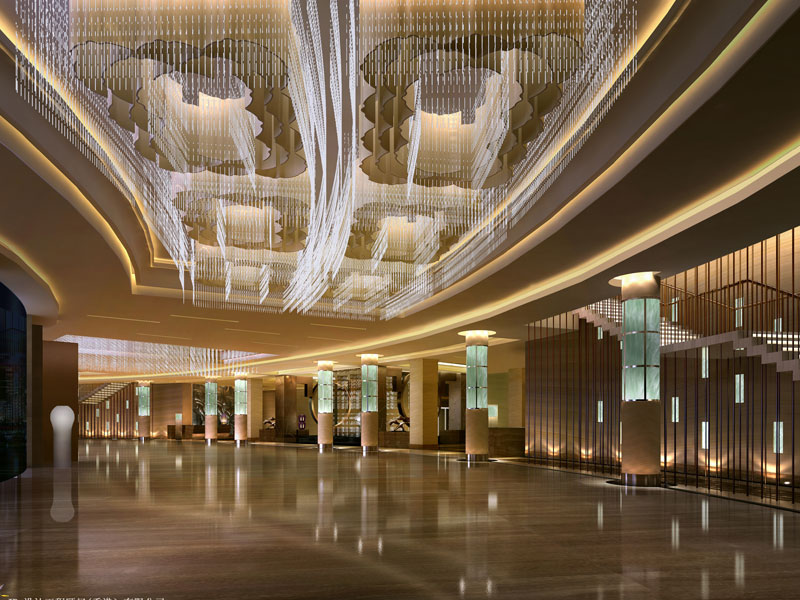 通過對整個酒店設(shè)計的梳理,得到外環(huán)境-建筑體-入口-大堂的設(shè)計順序,酒店顧客從室外進(jìn)入室內(nèi)首先感受的是建筑外環(huán)境,其次是整個建筑體,再者是主人口,最后是大堂。而大堂正是分隔室內(nèi)、外的重要過渡空間,大堂的延伸設(shè)計,除了必須保持與室內(nèi)設(shè)計風(fēng)格一致外,還可以通過運用高科技手法引入自然光線,達(dá)到形成大堂對室外環(huán)境的延伸的目的,從而創(chuàng)造開闊、明朗的視覺效果。