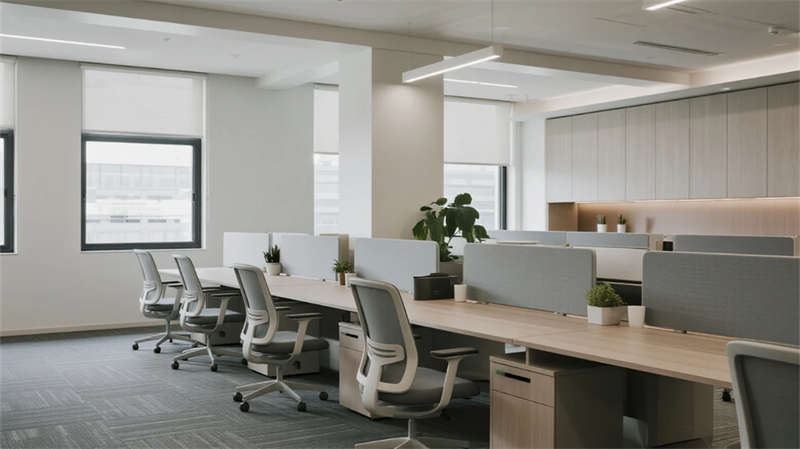 在現(xiàn)代簡(jiǎn)約風(fēng)格的引領(lǐng)下,該辦公空間以開放性和人文關(guān)懷為核心,打造了一個(gè)流暢而高效的日常工作環(huán)境。整體設(shè)計(jì)強(qiáng)調(diào)視覺統(tǒng)一性,通過淺色調(diào)的墻面與地板、簡(jiǎn)潔的家具線條以及自然元素的融入,營(yíng)造出寧靜而專業(yè)的氛圍。功能區(qū)之間無縫銜接,例如協(xié)作區(qū)與開放式辦公區(qū)通過綠植和智能燈光形成自然過渡,確保團(tuán)隊(duì)互動(dòng)的同時(shí)兼顧個(gè)人專注需求。休息茶水區(qū)則以溫馨的布局促進(jìn)員工放松,而創(chuàng)意工坊區(qū)則激發(fā)創(chuàng)新思維,多功能活動(dòng)區(qū)則支持多樣化的工作模式。
