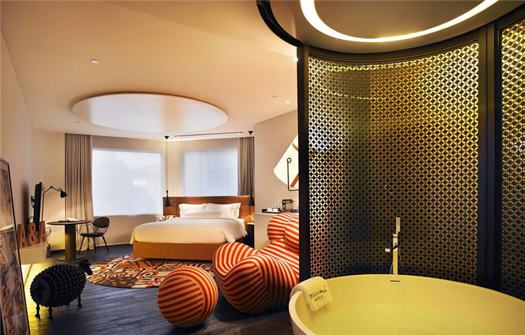 極簡主義風格并沒有妨礙設計師為酒店創(chuàng)造豐富的主題元素,以花草、猴子、孔雀、青蛙等為主題的森林圖案,遍布鏡面、墻壁等區(qū)域,營造了精致的“城市森林”效果。