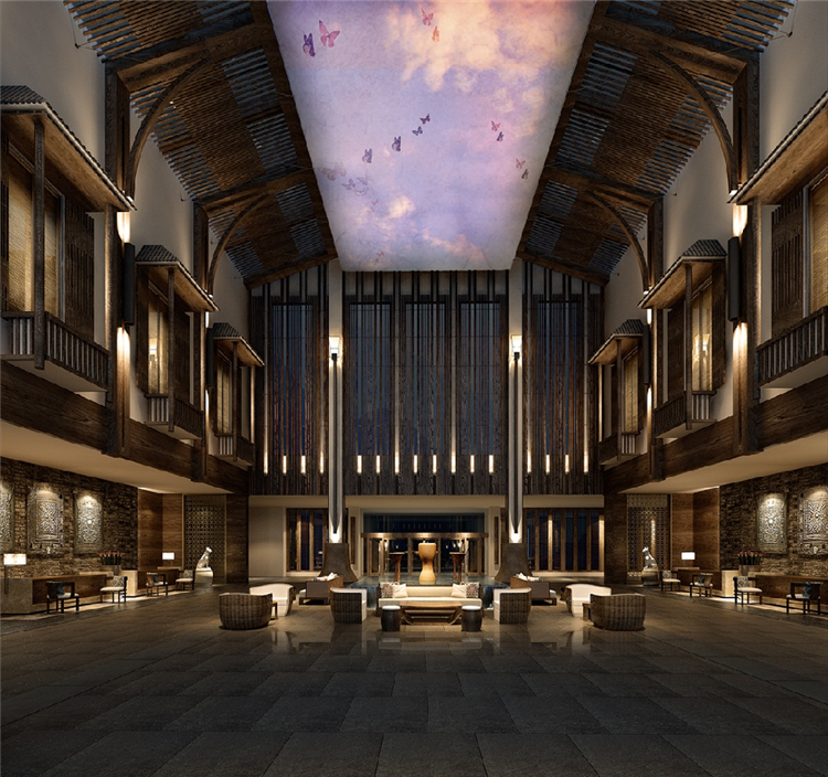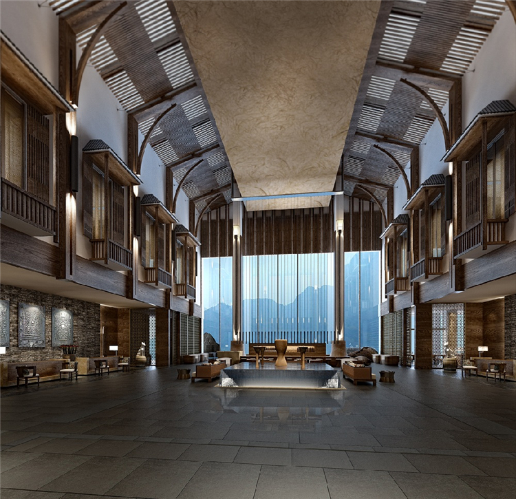 本案度假酒店的室內(nèi)設(shè)計靈感來自于瑤族民居的生活態(tài)度,并結(jié)合對大自然的尊重,運用天然素材以當(dāng)代風(fēng)格重新演繹傳統(tǒng)設(shè)計。山水表現(xiàn)“瑤美”,鼓火表現(xiàn)"瑤情”,圖騰犬則表現(xiàn)“瑤魂”。以盛大的篙火晚會為藍本。融入舞臺和展示空間的概念。以此增加戲劇化效果。提升賓客對空間的精神感知。