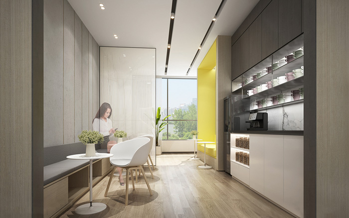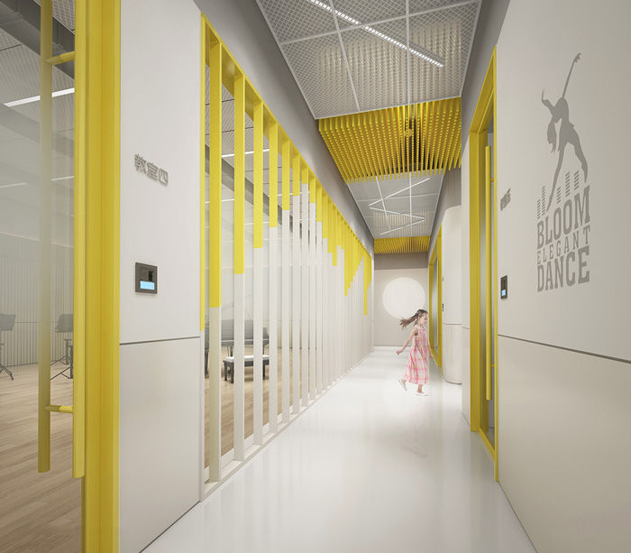 此處藝術(shù)學(xué)校設(shè)計(jì)中,告別了五彩斑斕的顏色,突出了空間的簡(jiǎn)潔與干凈,用黃色做為點(diǎn)綴色提升空間的趣味性。