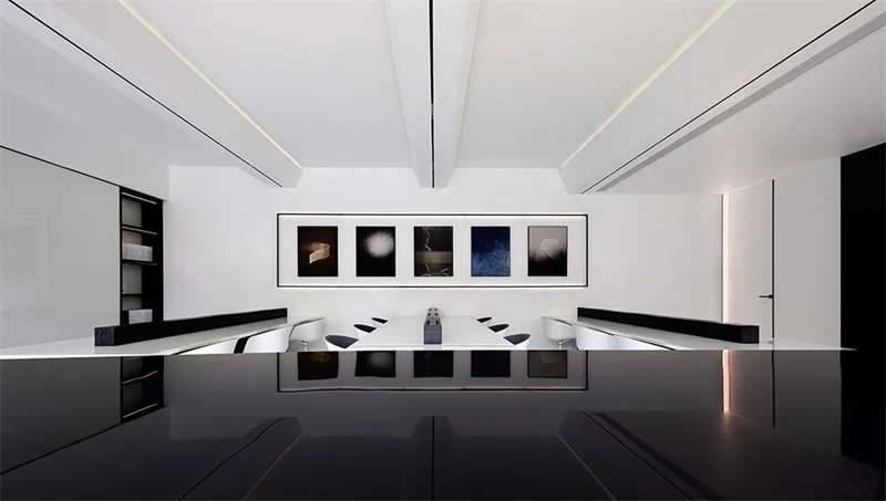 建筑是凝固的音樂,音樂是流動(dòng)的建筑。二、三層分別是開敞式辦公和高管辦公區(qū),空間整體黑白分明、線條硬朗,像是鋼琴的黑白鍵,揮灑自如,動(dòng)人的旋律,或悠揚(yáng)或激昂。