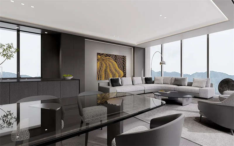 流暢的樓梯設(shè)計(jì)手法貫穿縱向空間,一氣呵成。黑白雙層欄桿扶手、無縫樹脂地坪和極具設(shè)計(jì)感的線性燈帶,把這種極致簡(jiǎn)約的設(shè)計(jì)風(fēng)格伸延到整個(gè)空間。