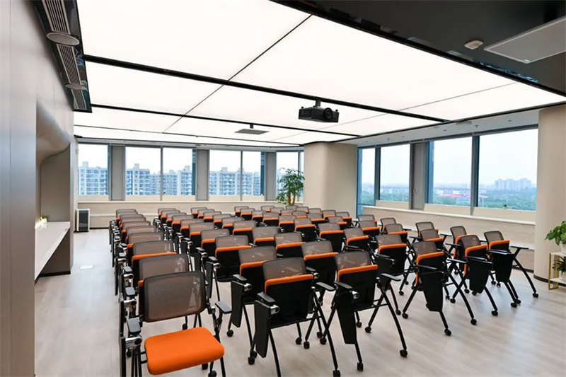 設(shè)計(jì)團(tuán)隊(duì)特意選擇了一處大型開敞的臨窗場(chǎng)地,在酷炫的3D裸眼展示室旁邊打造出了一個(gè)4S店風(fēng)格的培訓(xùn)和茶水的二合一空間,以滿足客戶快速發(fā)展的團(tuán)隊(duì)培訓(xùn)和新品發(fā)布的需求。在臨幕墻的位置,設(shè)計(jì)師原來就設(shè)計(jì)了一排沿窗的休閑階梯造型臺(tái)階,后來因?yàn)橐咔榉揽氐男枨?,把臺(tái)階內(nèi)的空間利用好,平時(shí)內(nèi)部可以儲(chǔ)藏睡袋,防疫物資,帳篷等物品。