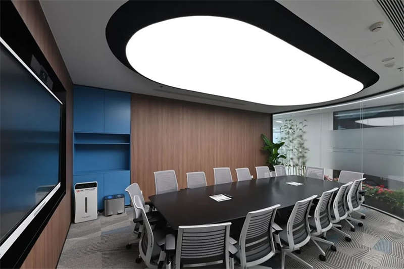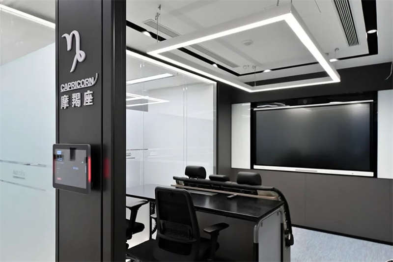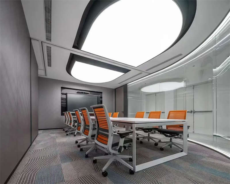 在接待前廳左右兩邊各設(shè)置了一個(gè)大會(huì)議室,其中一個(gè)是現(xiàn)代酷灰的可二合一的會(huì)議室,另一個(gè)是穩(wěn)重優(yōu)雅的行政會(huì)議室。感謝成品隔斷供應(yīng)商卡萊斯卓的緊密配合和支持,在設(shè)計(jì)師的要求下,把LED燈帶嵌入了雙層玻璃隔斷中。讓整個(gè)會(huì)議室區(qū)域看上去充滿科技感!